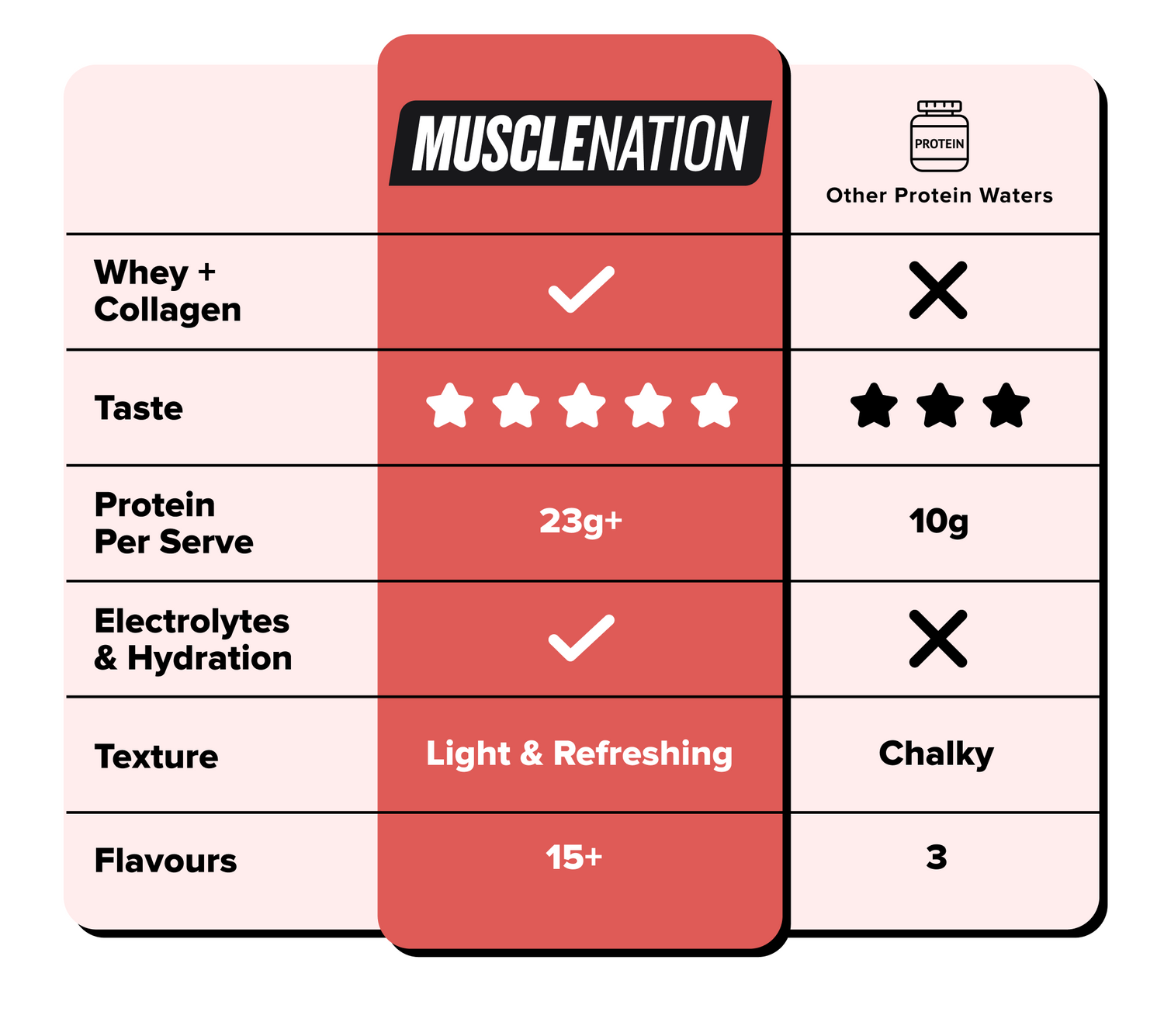 A refreshing clear protein water supplement which is a light alternative to the usual milky protein shake. With the benefits of protein, collagen, electrolytes and BCAA's, the Muscle Nation Protein Water is a fruity and thirst quenching drink to use any time of the day.