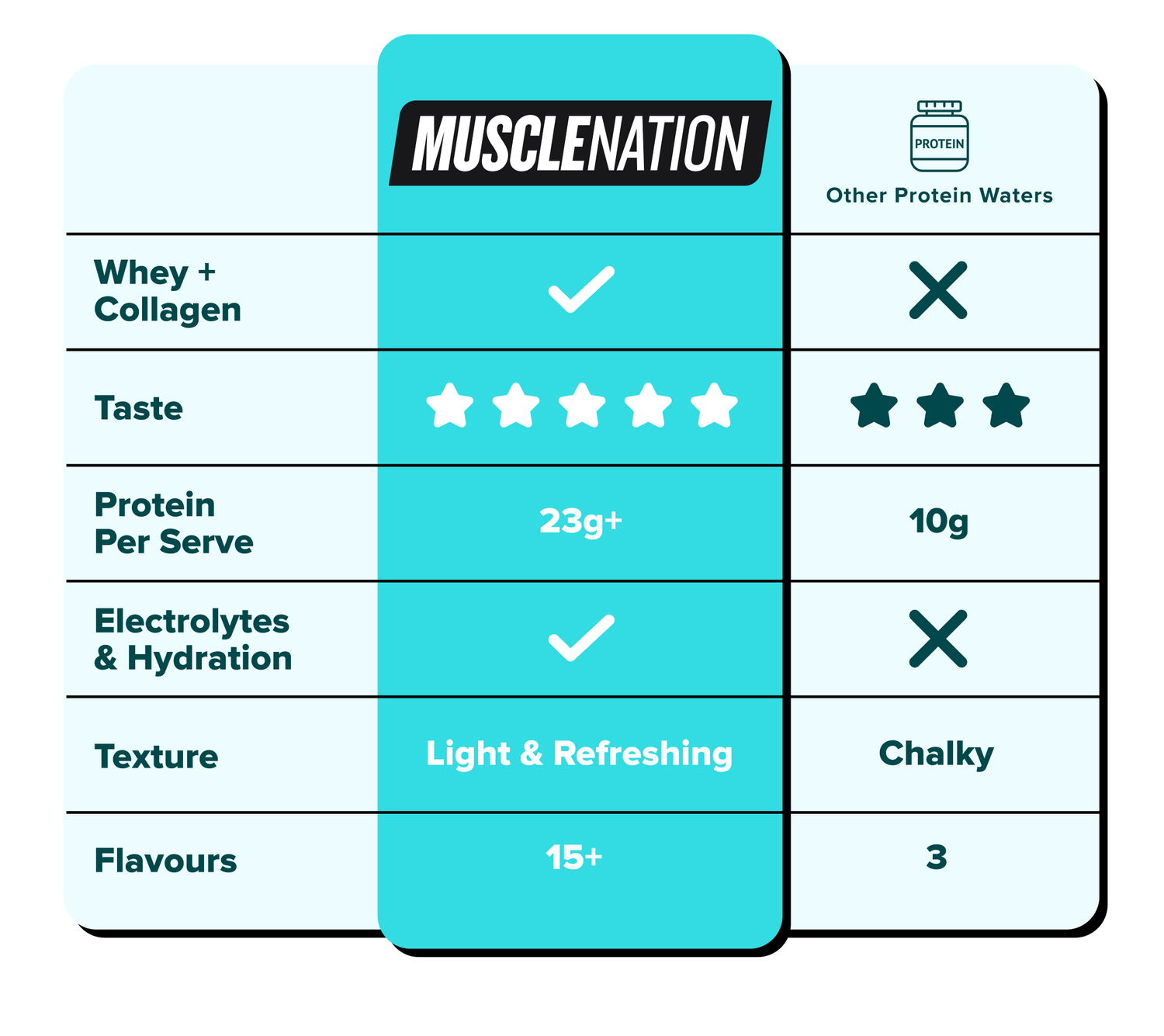 A refreshing clear protein water supplement which is a light alternative to the usual milky protein shake. With the benefits of protein, collagen, electrolytes and BCAA's, the Muscle Nation Protein Water is a fruity and thirst quenching drink to use any time of the day.