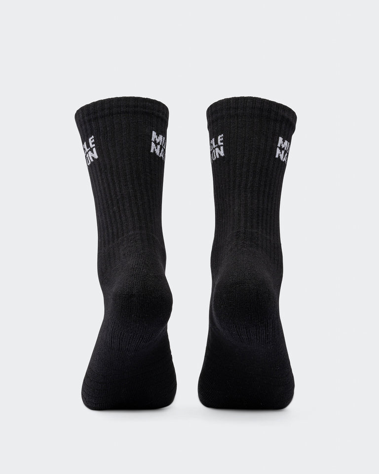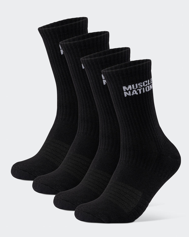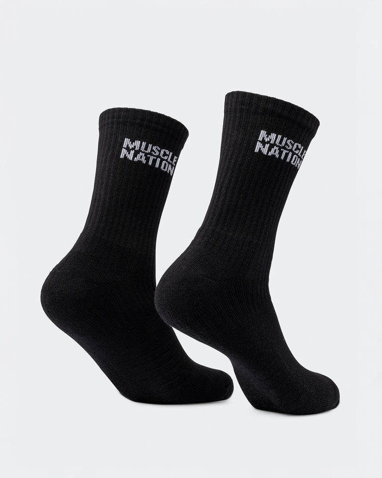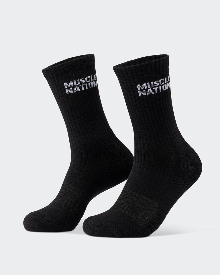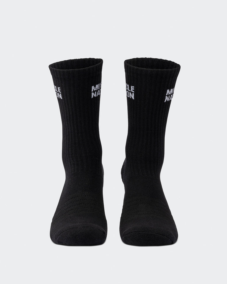 Step up your sock game with Muscle Nation Essential Crew Socks. This 2-pack combines style and function with a classic crew length and signature MN branding. Made from a premium cotton blend, these socks offer just the right amount of cushioning and stretch for all-day comfort, whether you're hitting the gym or the streets. The perfect balance of performance and everyday wear.