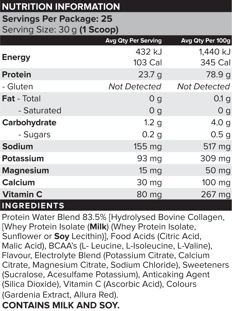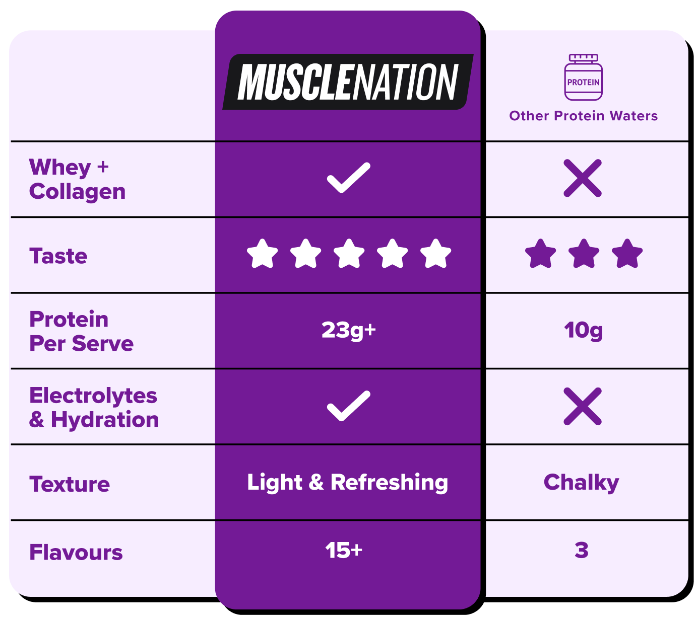 A refreshing clear protein water supplement which is a light alternative to the usual milky protein shake. With the benefits of protein, collagen, electrolytes and BCAA's, the Muscle Nation Protein Water is a fruity and thirst quenching drink to use any time of the day.