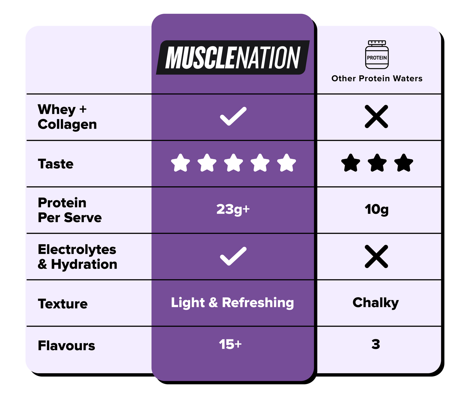 A refreshing clear protein water supplement which is a light alternative to the usual milky protein shake. With the benefits of protein, collagen, electrolytes and BCAA's, the Muscle Nation Protein Water is a fruity and thirst quenching drink to use any time of the day.