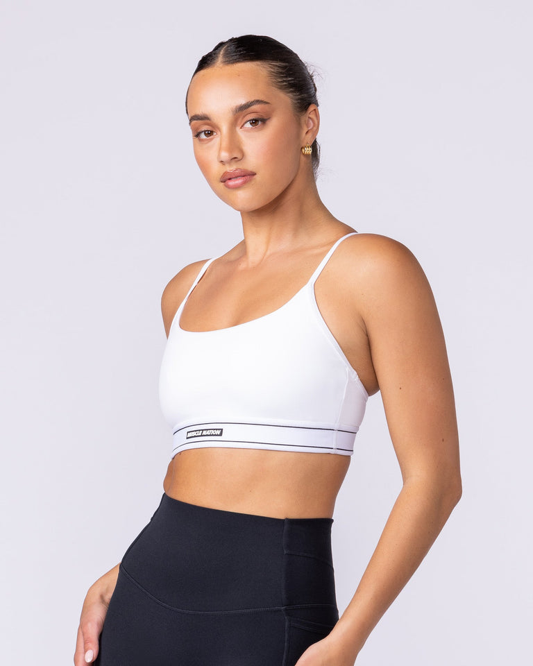 The Relay Bra is your new go-to for both training and everyday wear. Designed with a flattering scooped neckline and narrow bind straps, this sports bra offers medium support with a soft, stretchy feel. The elastic hem features a stripe detail and subtle MN branding for a sporty finish. Made from our Everyday fabric using recycled polyester, it delivers comfort, style, and sustainability in one.