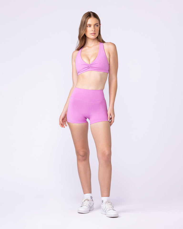 The Vixen Bra is an everyday essential that blends a flattering shape with dependable comfort. The front scrunch detail creates a subtle V neckline, while the racer back design allows easy movement. Finished with an encased elastic hem band for a secure feel and crafted from our Signature Fabric for a more compressive hold. Includes non boost removable padding and an MN logo on the back panel.