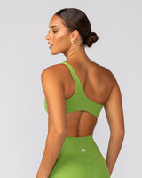 The Chosen Bralette delivers effortless comfort with a clean, sporty look. Made from buttery soft recycled polyester fabric, it gently stretches to move with you. The asymmetric neckline and dual shoulder straps create a flattering silhouette, while the open back keeps it breathable and minimal. Finished with a subtle Muscle Nation logo and a no dig waistband for all day ease.