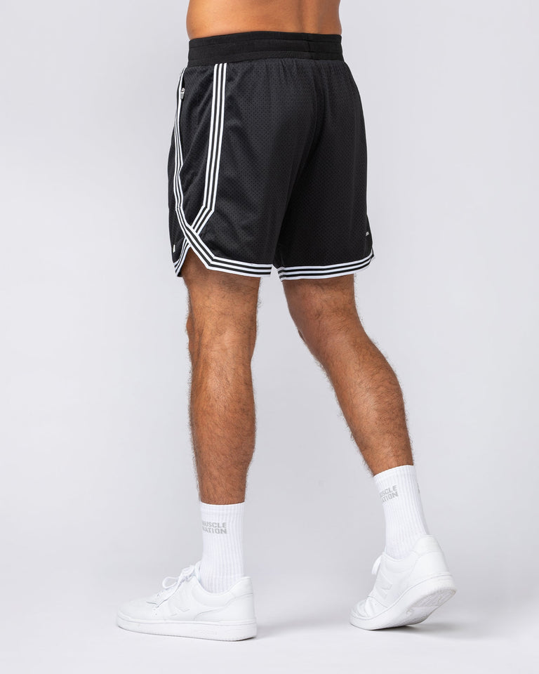 The Courtside Basketball 5" Shorts are made for movement, comfort and everyday wear. With a relaxed fit and breathable mesh construction, these shorts bring a classic court-inspired look to your gym rotation. Designed with an elasticated waistband with drawcords for a secure feel, plus side pockets for added function. The five inch inseam keeps things mobile, while striped taping down the side legs and hem adds a sharp, athletic edge.