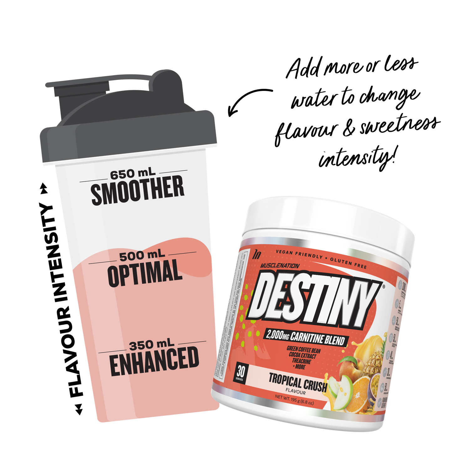 Destiny has the perfect amount of caffeine (150mg per serve), to help kick start your morning, pick-me-up during the day and before any activity (cardio, workout etc). Destiny tastes amazing, and is a customer favourite.