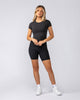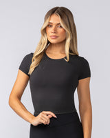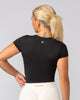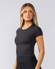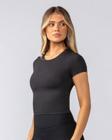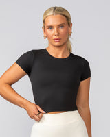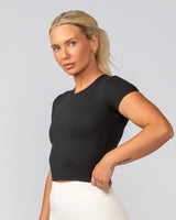 The Essential Cropped Tee is your ultimate layering piece. Features a fitted silhouette with cropped length that pairs perfectly with high-waisted bottoms. Made from super-soft recycled fabric for all-day comfort, this versatile piece works for both workouts and casual styling.