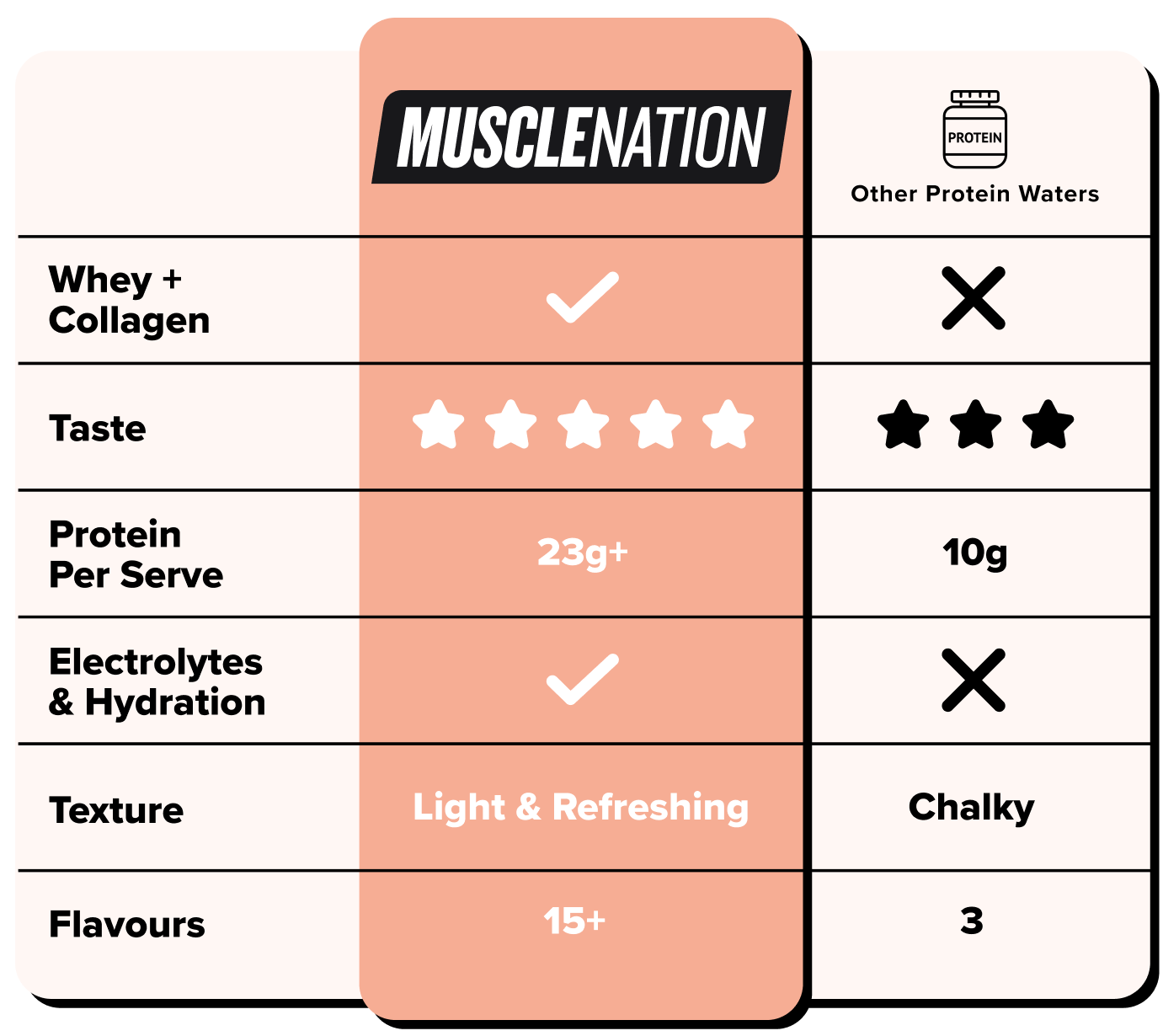A refreshing clear protein water supplement which is a light alternative to the usual milky protein shake. With the benefits of protein, collagen, electrolytes and BCAA's, the Muscle Nation Protein Water is a fruity and thirst quenching drink to use any time of the day.