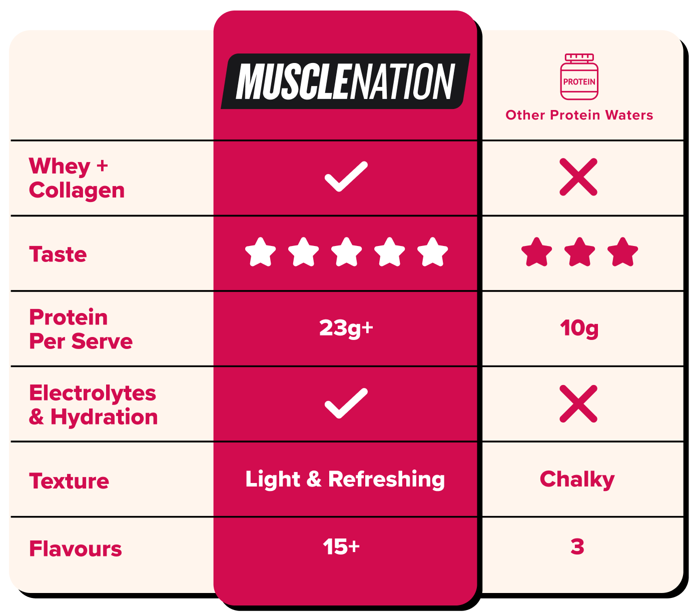 A refreshing clear protein water supplement which is a light alternative to the usual milky protein shake. With the benefits of protein, collagen, electrolytes and BCAA's, the Muscle Nation Protein Water is a fruity and thirst quenching drink to use any time of the day.