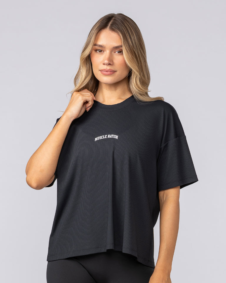The Rib Boxy Training Tee in Black is designed for movement with a lightweight, breathable feel. Made from our Active Rib fabric, it features a relaxed, boxy fit with drop arm sleeves and a ribbed neckline for comfort. The shorter length gives it a modern edge, while the Varsity logo on the chest keeps it sporty and bold.