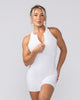 Meet your new workout essential - the Rib Zip Up One Piece designed in collaboration with Pro Body Builder - Hattie Boydle. This fitted one-piece combines style and performance with its high neckline and front lockable zipper for adjustable coverage. Our lightweight rib fabric, combined with thick cross back straps and a deep V open lower back, enhances your shape. Internal shelf bra with removable padding offers support, while the new design includes non-stretch taping in the back rise seam for extra booty contouring.
