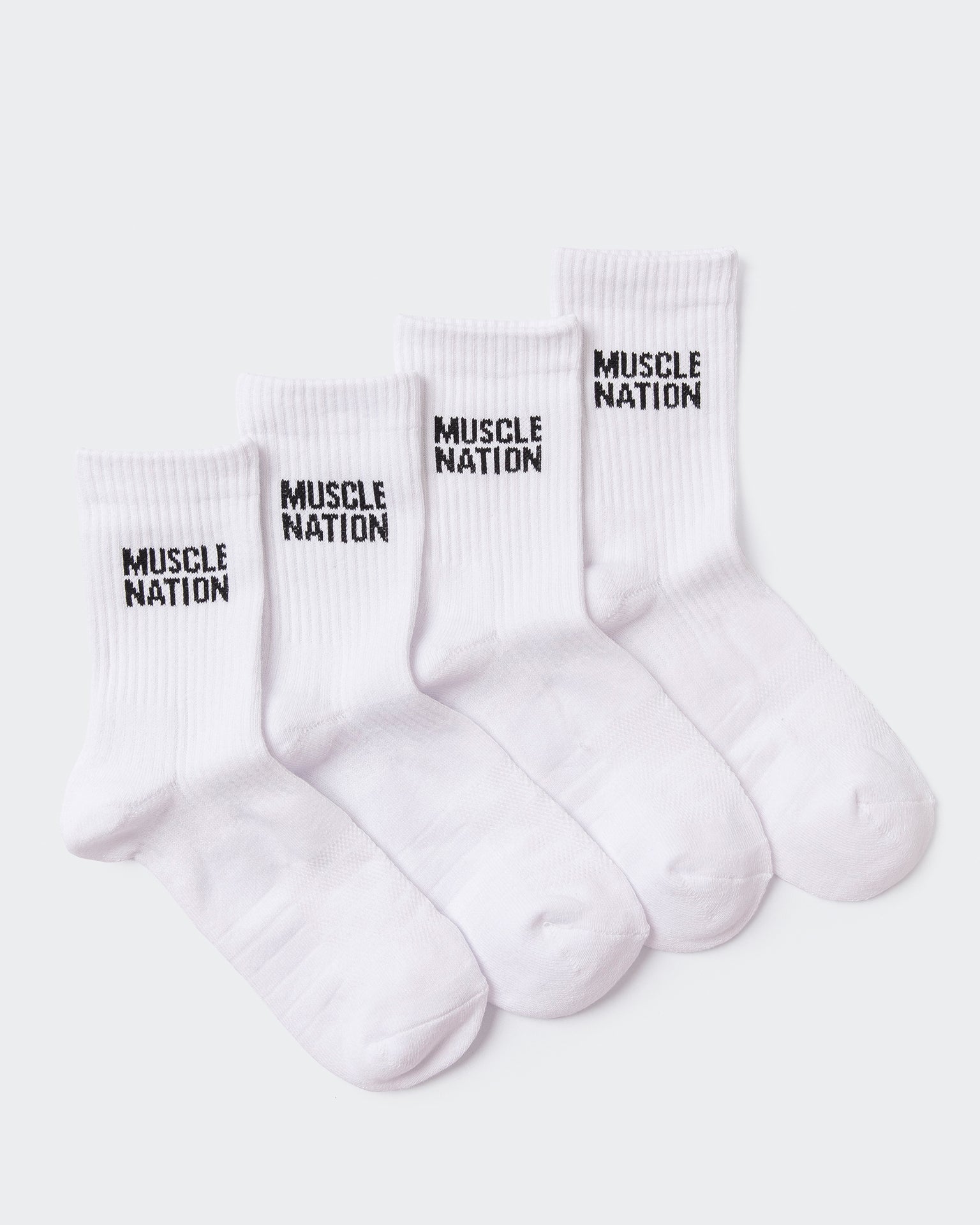 Step up your sock game with Muscle Nation Essential Crew Socks. This 2-pack combines style and function with a classic crew length and signature MN branding. Made from a premium cotton blend, these socks offer just the right amount of cushioning and stretch for all-day comfort, whether you're hitting the gym or the streets. The perfect balance of performance and everyday wear.